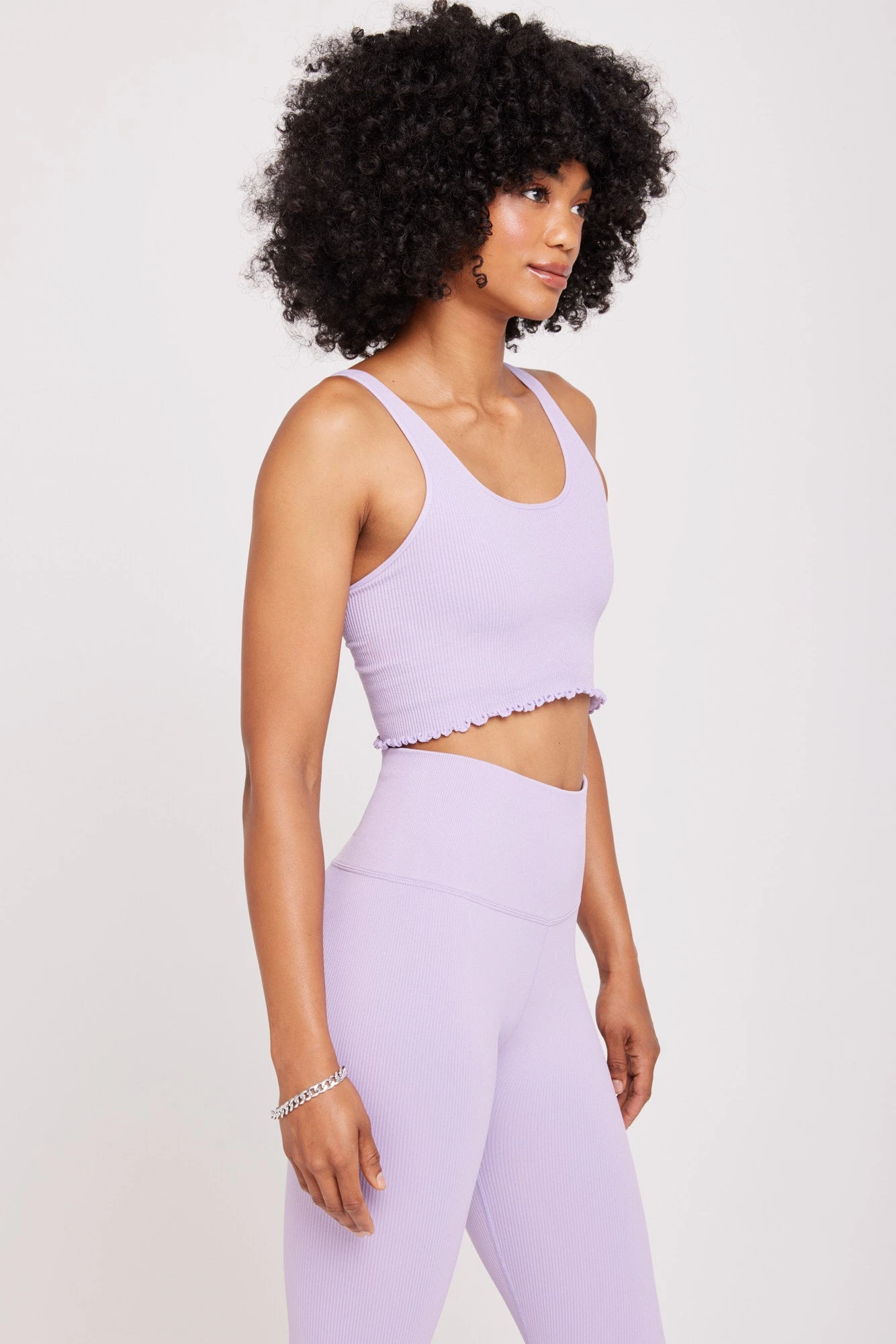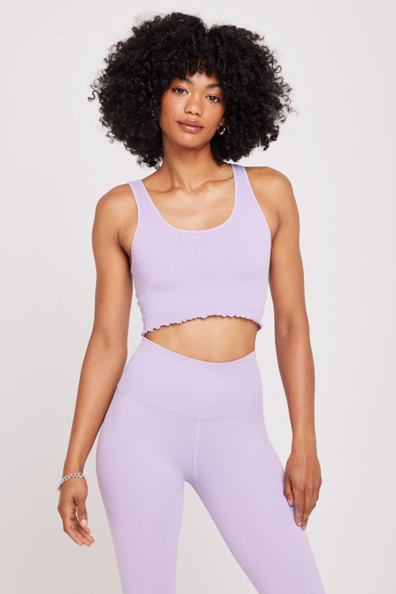 Do all things with love. A crop tank with built-in shelf bra, supportive straps, and a racerback cut with a ruffle hem. Made from our compressive & soft seamless rib fabric.