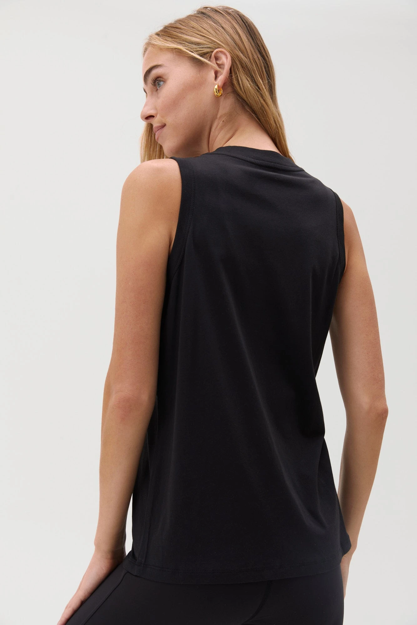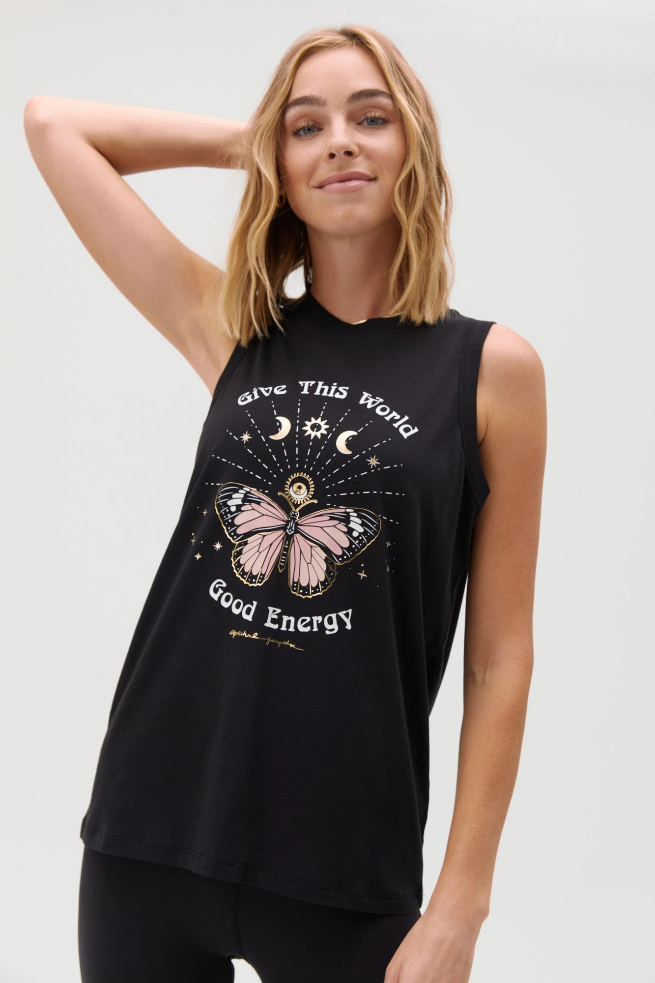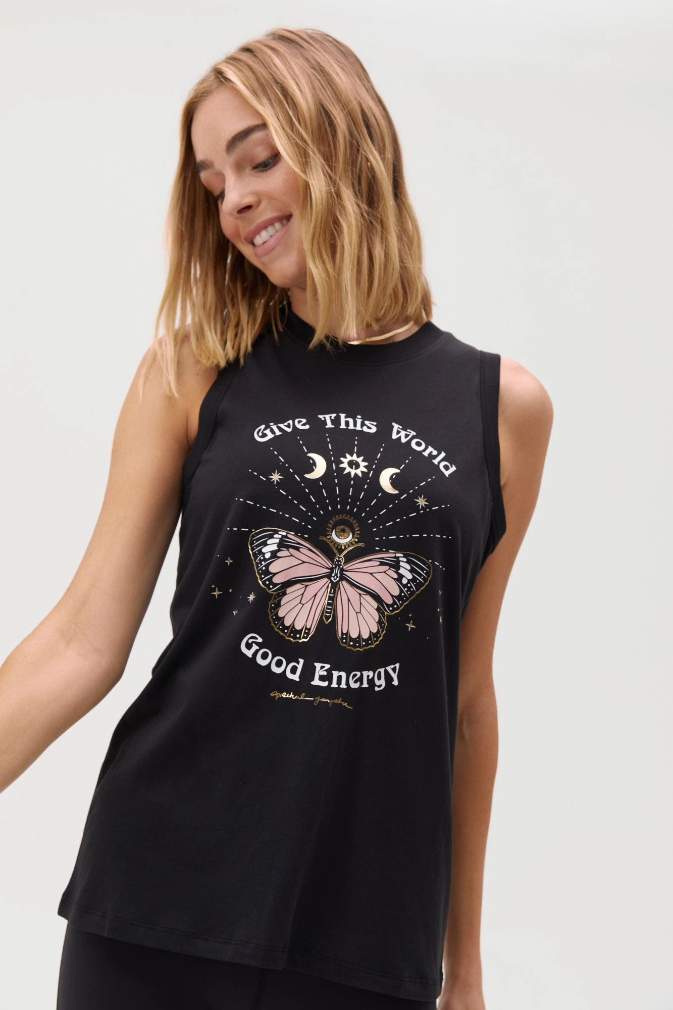 Good energy abounds. Designed in a soft, modal jersey fabric, with gold foil details, cut for a slightly longer length to keep you covered through downward dog and beyond — its a must-have tank that truly lives up to its name.