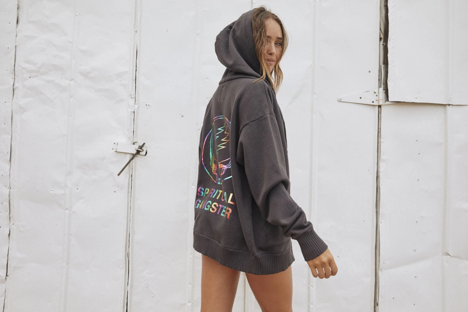 Grateful state of mind. A relaxed fit zip hoodie with front side pockets and rib side panels. Part of the Grateful Dead x Spiritual Gangster collaboration, this limited edition hoodie has a rainbow metallic Grateful Dead print. Made with 100% cotton.