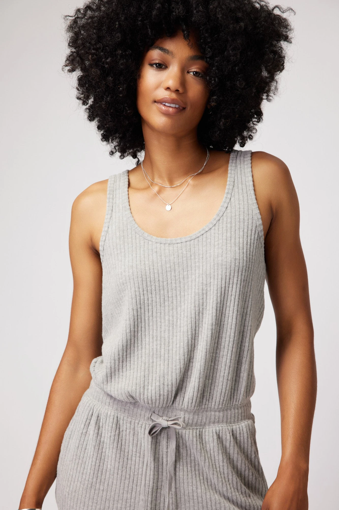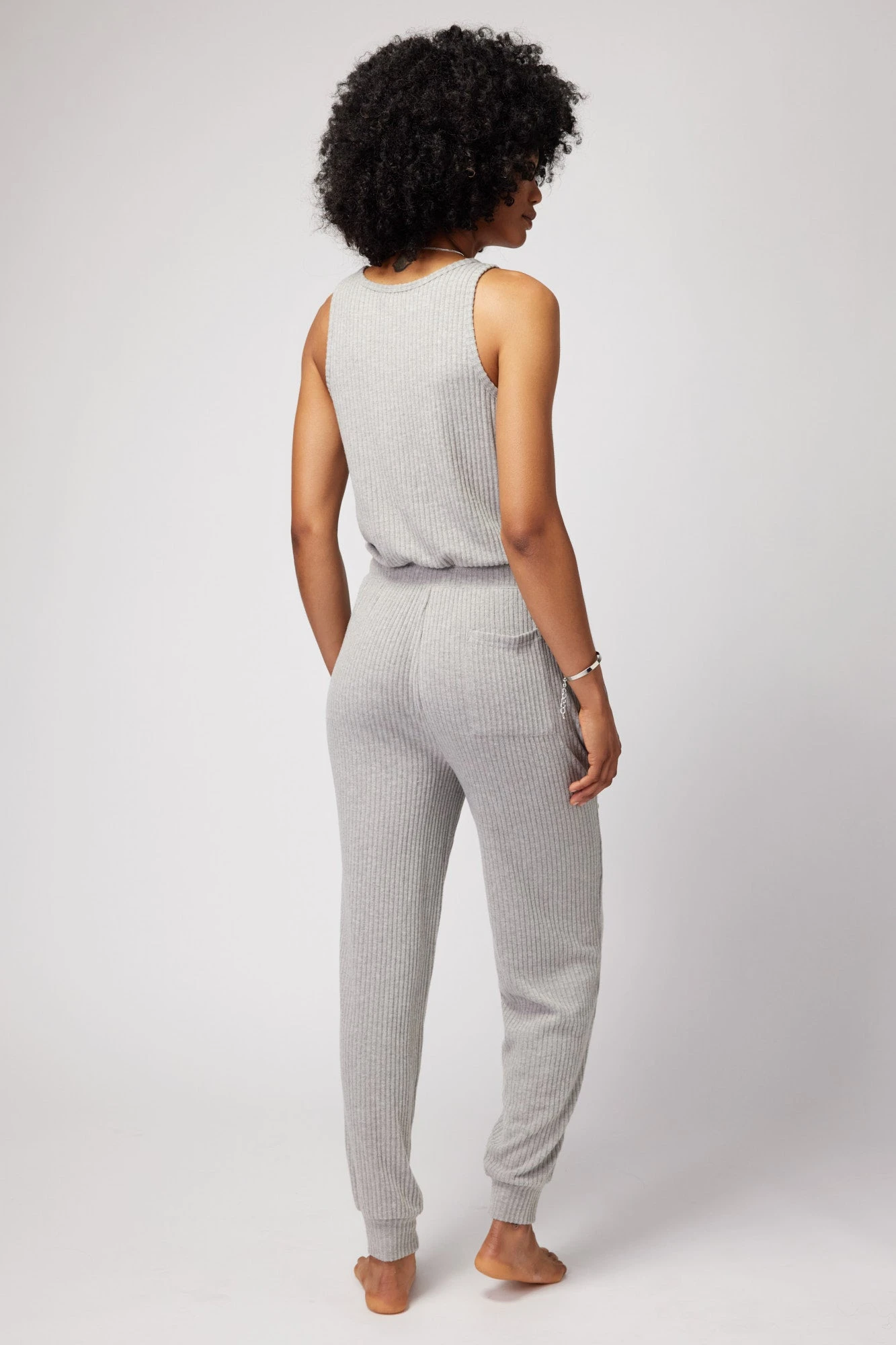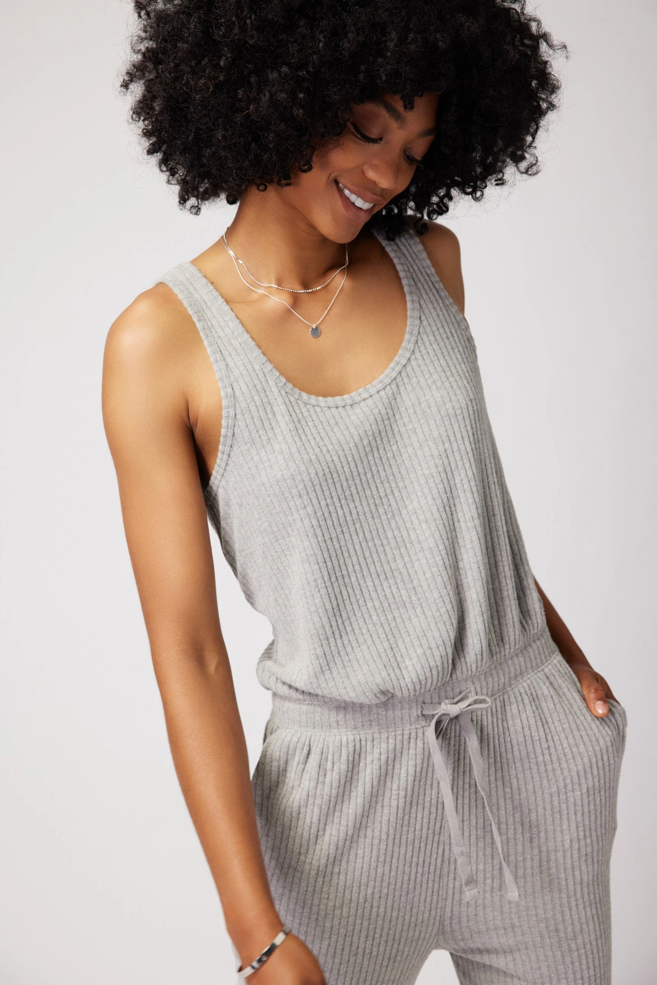 One and done. A cozy jumpsuit designed with jogger style bottom fit, rib hem cuffs, side slit pockets, and self dye to match drawcord. Made with our soft ribbed fabric featuring a slight stretch for ultimate cozy.