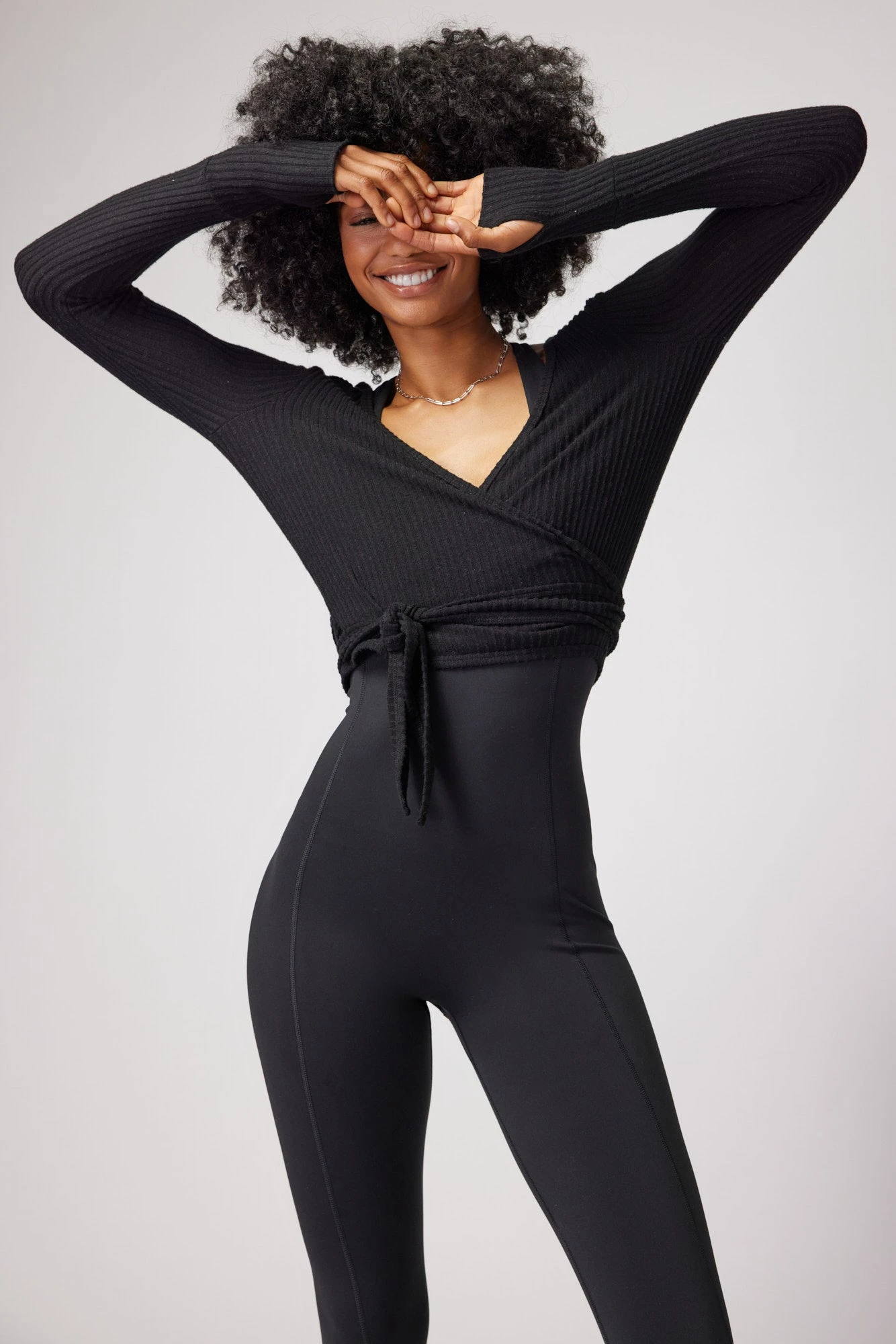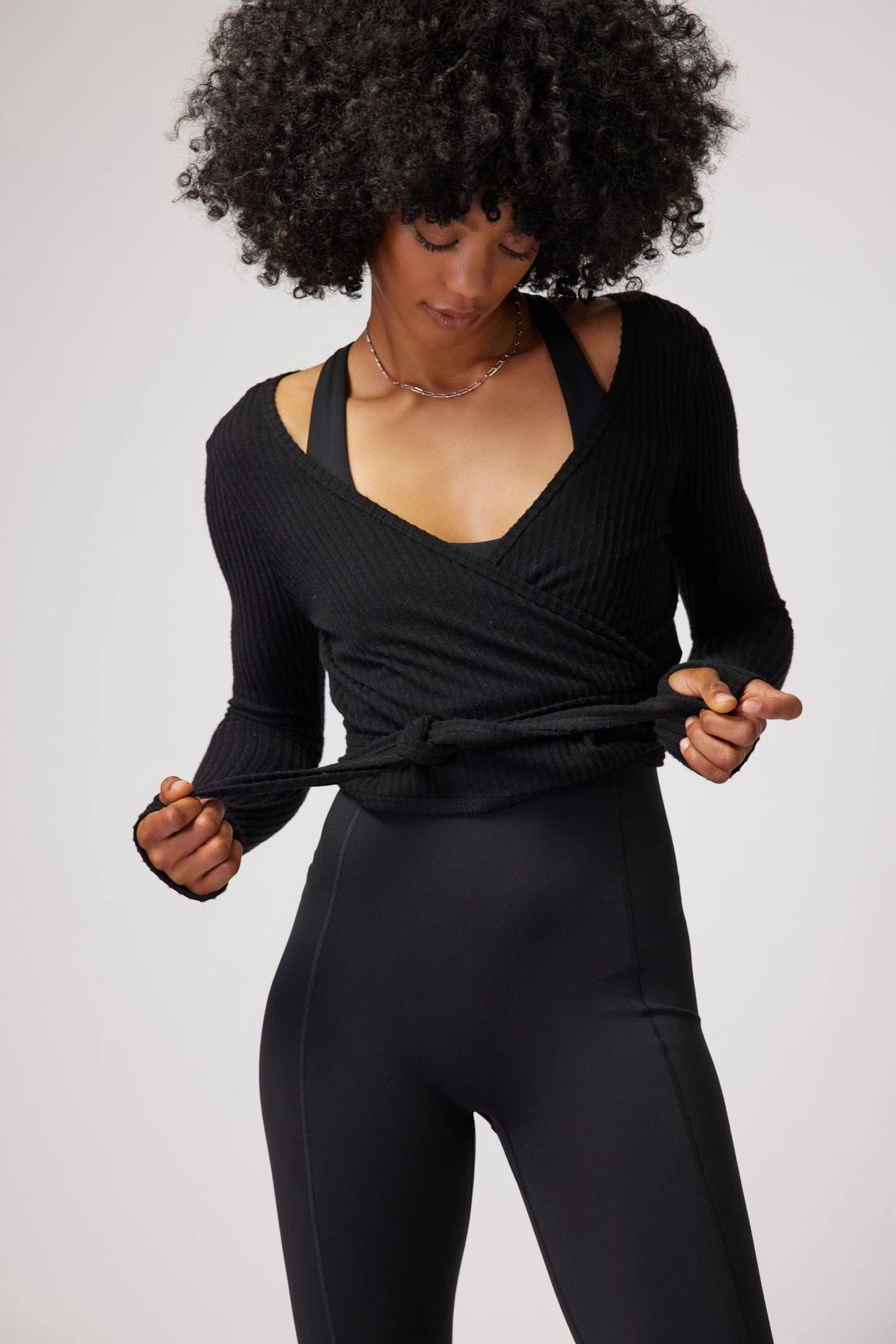 Wrapped in love. A sweater with a wrap front detail, thumbholes at sleeves, and a cropped fit. Made with our soft ribbed fabric featuring a slight stretch for ultimate cozy.