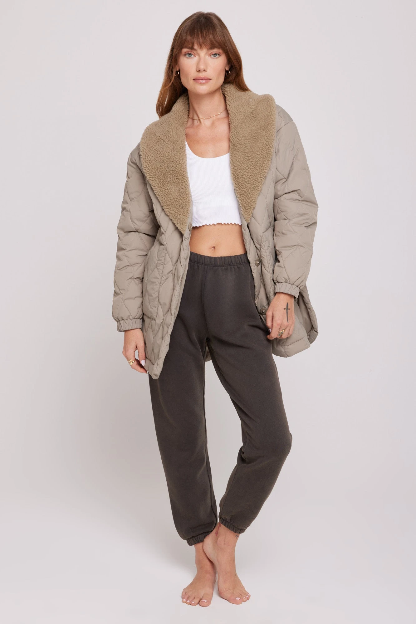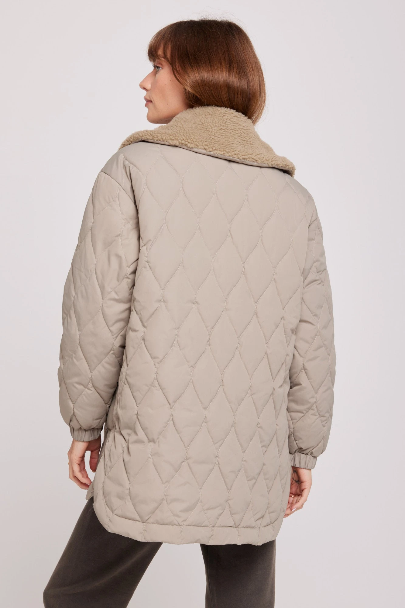 Ivy League. A quilted jacket with shirt tail fit and pockets with interior snap closure. Designed with a stylish sherpa shawl collar.