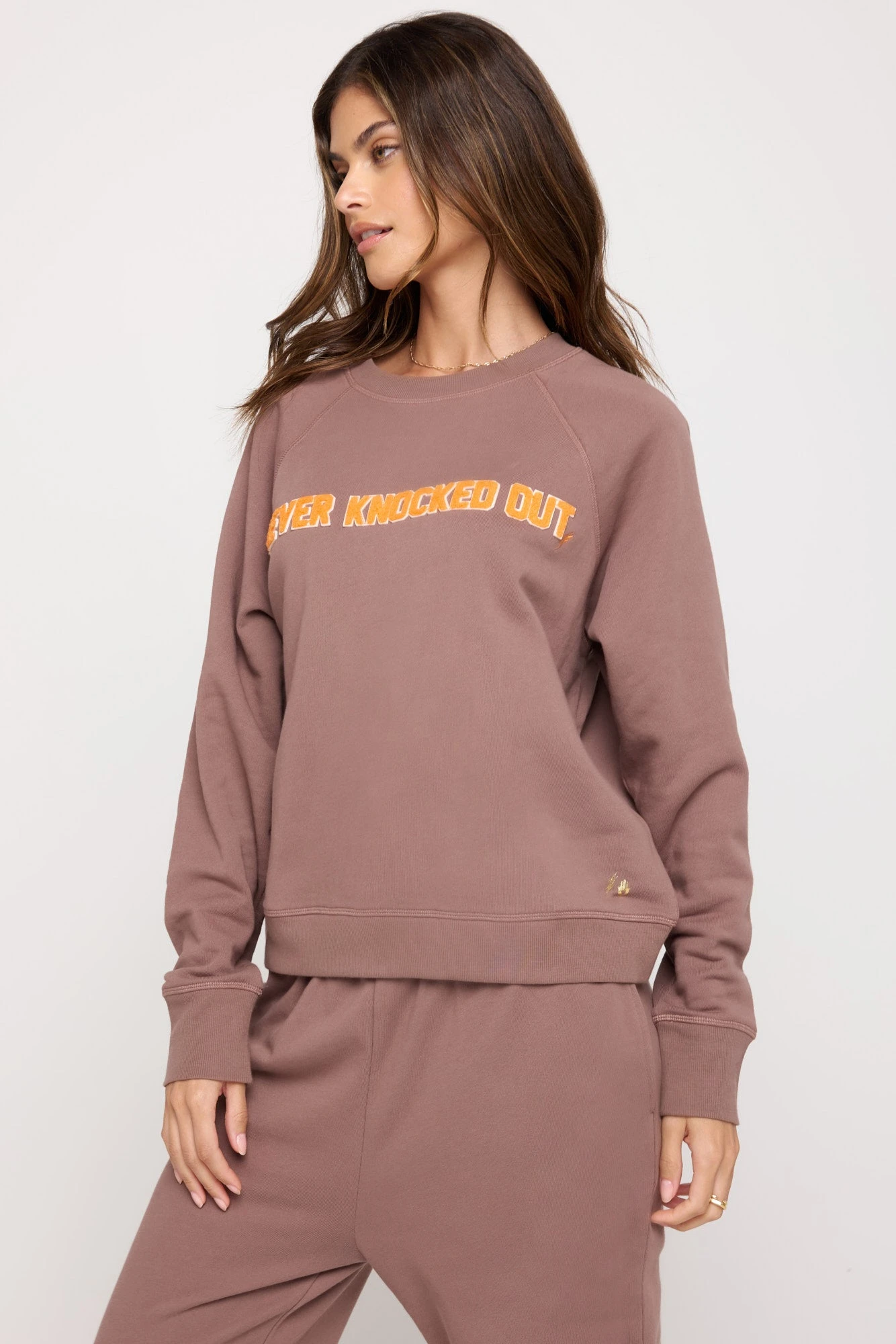 Kendall Toole x Spiritual Gangster. A crewneck raglan sleeve sweatshirt with an overall relaxed fit. This limited-edition sweatshirt is designed with Kendall’s signature mantra, “Never Knocked Out”, as a custom chenille patch and a signature lightning bolt logo detail. Made with 100% cotton.