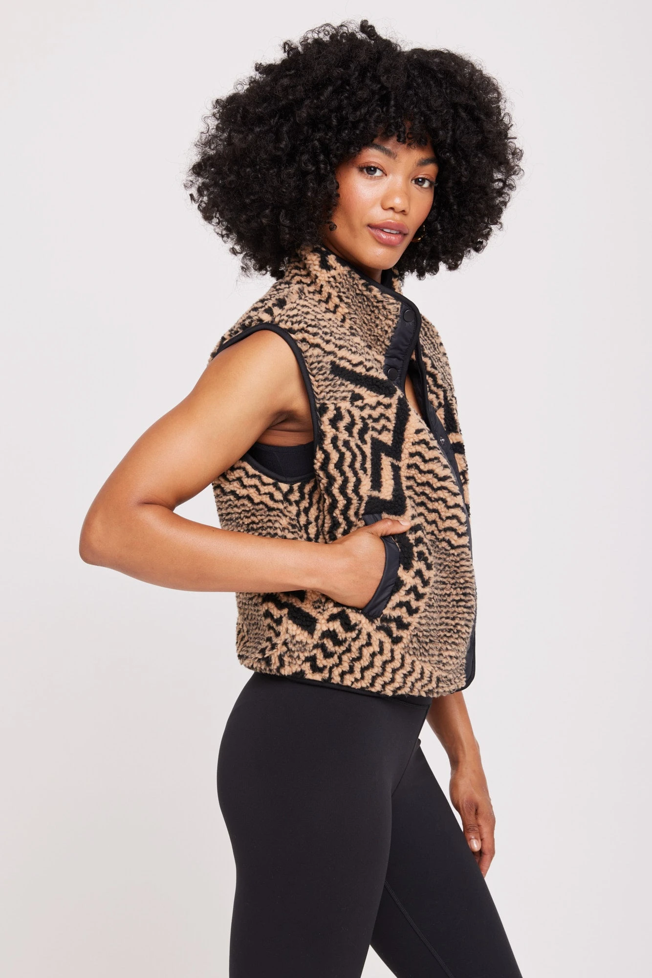 Good investment. A boxy fit sherpa vest. Designed with a snap front closure and side pockets. Made with a faux fur shell.