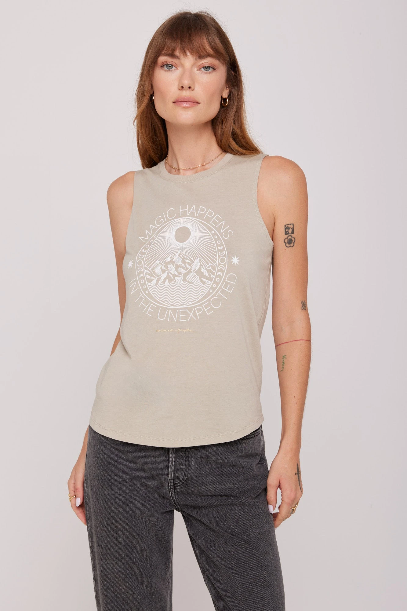 More magic, please. Our best-selling muscle tank designed with a relaxed crew neck and shirttail hem. Made with comfortable cotton and modal, this tank features a new graphic you’ll love.
