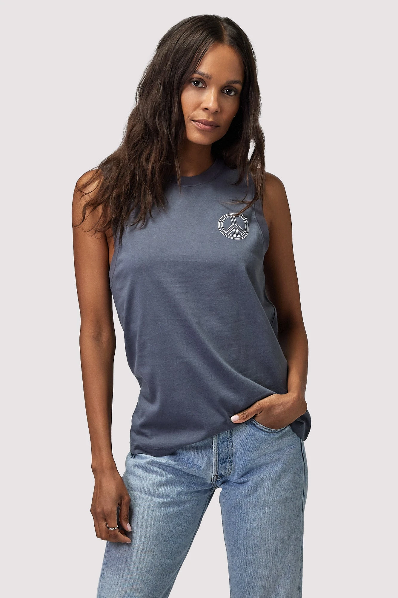 Rest in peace. A time-tested muscle tank designed with a relaxed crew neck and shirttail hem. Made with comfortable cotton and modal, this tank features a new peace graphic you’ll love.