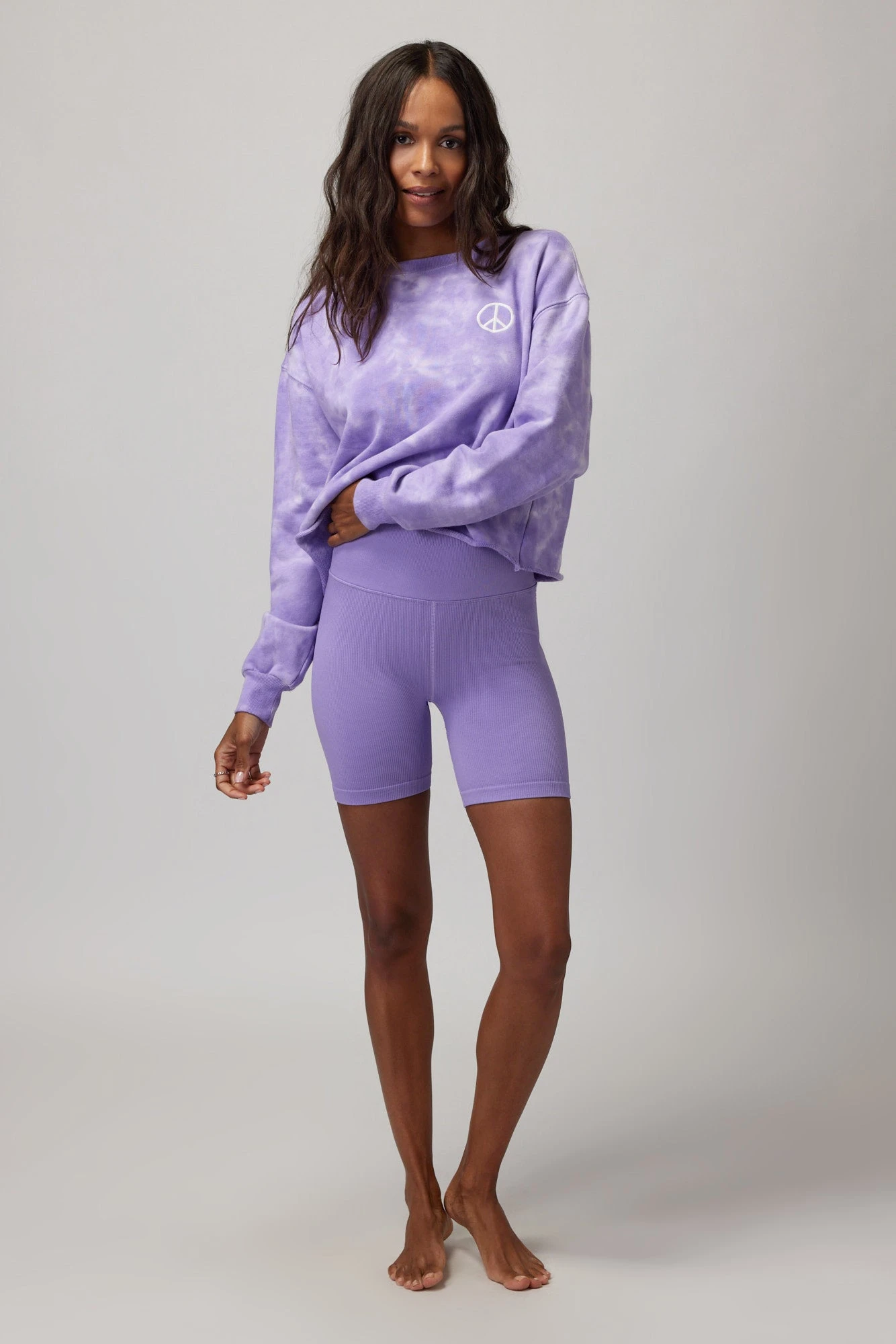 Our popular Mazzy sweatshirt gets a tie dye update this season. Featuring a raw edge, relaxed crop fit, and a classic crew neck, super soft cotton blend terry delivers breathable coziness, perfect to throw on after your early morning flow or late-night meditation.