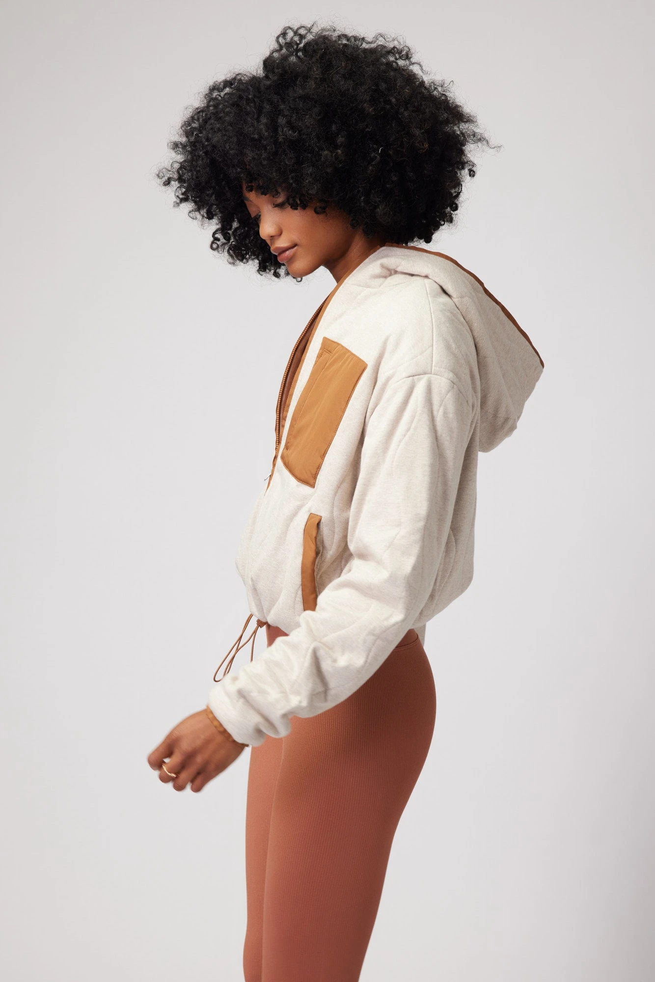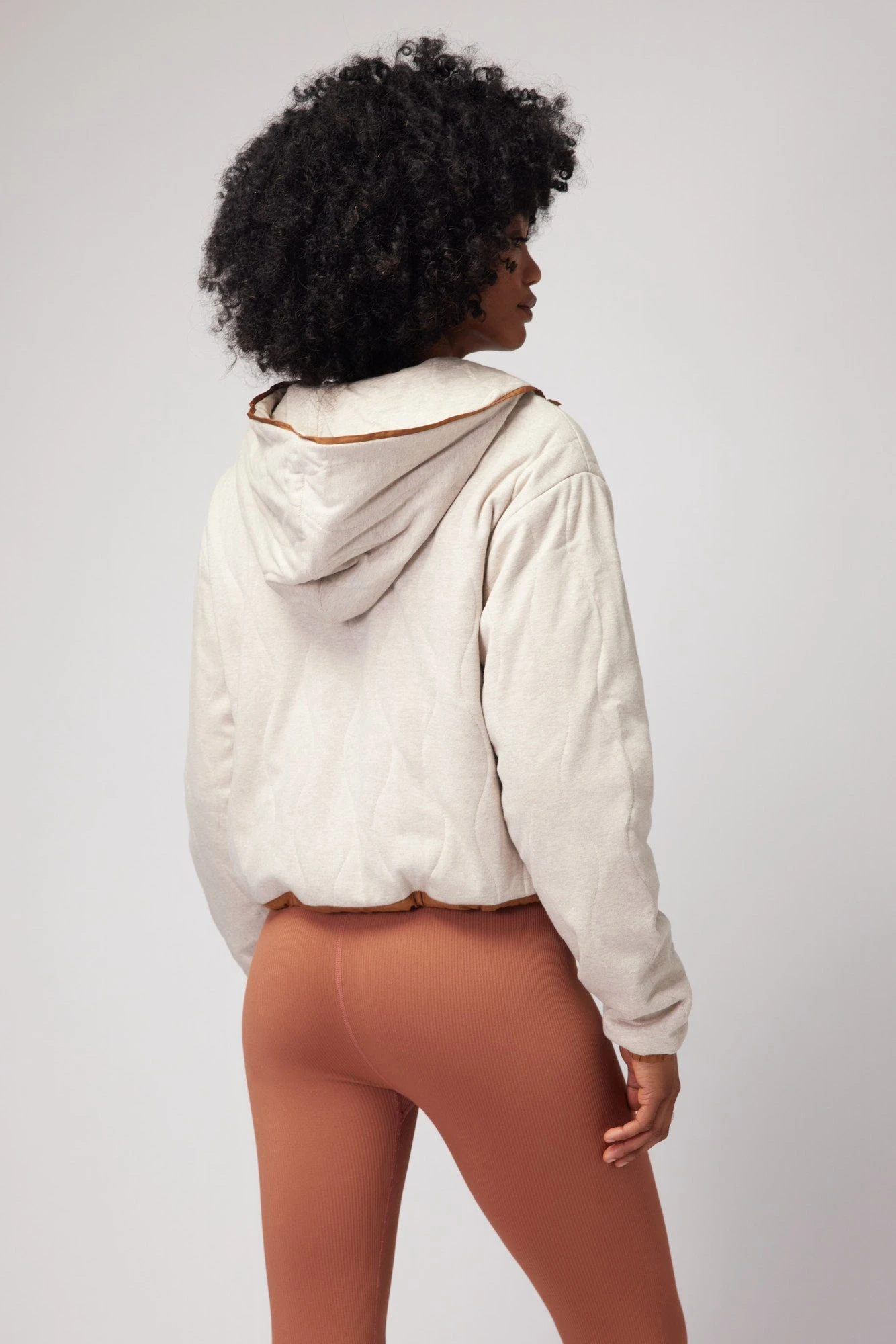 Fully committed to the cause. A crop length, relaxed fit quilted jacket with full zip, encased bungee cord at sweep, front side pockets and chest patch pocket with zipper closure.